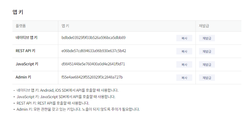 이제 제가 등록한 앱에 대한 앱 키를 받아옵니다.